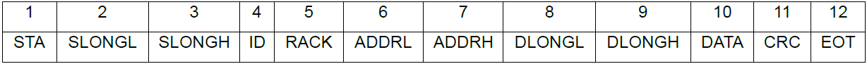 SLONGL、SLONGH:SLONGH其后指令字節(jié)數(shù),從STA開始,以十六進(jìn)制雙字節(jié)表示,低字節(jié)在前,高字節(jié)在后。如果其后字節(jié)數(shù)為8個(gè),則SLONGL SLONGH寫入:08 00,如果其后字節(jié)數(shù)為20個(gè),則SLONGL SLONGH寫入:14 00。