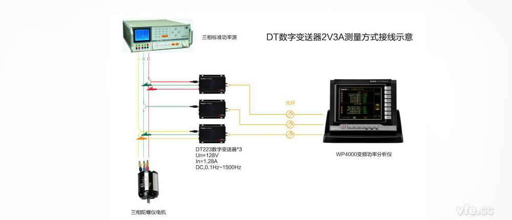 本次測(cè)試采用湖南銀河電氣有限公司研制的WP4000變頻功率分析儀,該分析儀是目前國(guó)家變頻電量測(cè)量?jī)x器計(jì)量站的測(cè)量基準(zhǔn),測(cè)試數(shù)據(jù)具有較高的精度和最高的權(quán)威性。 根據(jù)被測(cè)電機(jī)的電壓和電流,WP4000 的功率單元選擇 DT223B(128V/1.28A)數(shù)字變送器。每個(gè)DT 數(shù)字變送器可連接一路電壓和一路功率。 由于電機(jī)未引出中性線,一般采用二瓦計(jì)法測(cè)量三相功率,為了更加準(zhǔn)確直接的反映三相電流,每相電流均采用一個(gè)DT數(shù)字變送器進(jìn)行測(cè)量。
