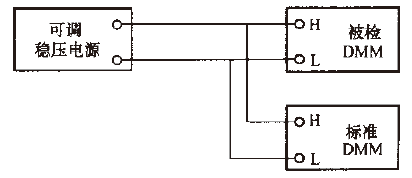 直接比較法如圖3所示。一般情況下標準數(shù)字電壓表的位數(shù)應(yīng)比被檢表多一位。輸出電壓源要考慮其穩(wěn)定度、調(diào)節(jié)細度與紋波等技術(shù)指標。一般來說穩(wěn)定度應(yīng)小于被檢表允許誤差1/5~1/10,調(diào)節(jié)細度應(yīng)小于被檢表允許誤差的1/10。紋波的影響應(yīng)不引起標準表和被檢表的跳字。對于標準表應(yīng)保證其準確可靠,為此必須對標準表進行定期的檢定和校準。標準表的誤差可以按分時段指標來考慮。