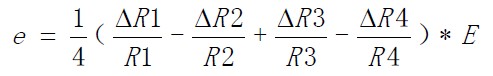 若四枚應(yīng)變片完全相同,比例常數(shù)為K,且應(yīng)變分別為ε1 、ε2 、ε3 、ε4,則上式可寫(xiě)成下面的形式:
